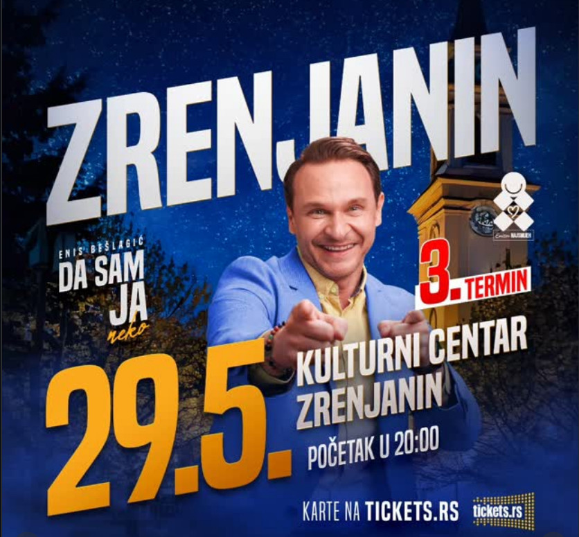 najnovije ENIS BEŠLAGIĆ 29. MAJA PONOVO U KULTURNOM CENTRU: Pogledajte predstavu „Da sam ja neko“ 24/04/2026 Miroslava Malbaški Zbog velikog interesovanja predstava Enisa Bešlagića ponovo će biti izvedena na velikoj sceni Kulturnog centra u petak, 29. maja, u 20 sati. Ulaznice po ceni od 1.500 dinara mogu se kupiti na svim prodajnim mestima Tickets-a i na njihovom sajtu. Povezane vesti:ENIS BEŠLAGIĆ PONOVO U ZRENJANINU: Pogledajte predstavu „Da sam ja neko“POZORIŠNA PREDSTAVA 14. OKTOBRA U KULTURNOM CENTRU: „Žene u crvenom“U PETAK, 22. NOVEMBRA U KULTURNOM CENTRU: Predstava „Suze su OK“.OPERSKI PEVAČ SAŠA VRABAC O SVOJIM MUZIČKIM POČECIMA, USAVRŠAVANJU, SEĆANJIMA NA ZRENJANINSKROMNA PONUDA I VISOKE CENE UDALJILE SUGRAĐANE SA PLIĆIM DŽEPOMSUOČAVANJE DOKTORKE I NARODNE POSLANICE PRED SUDOM